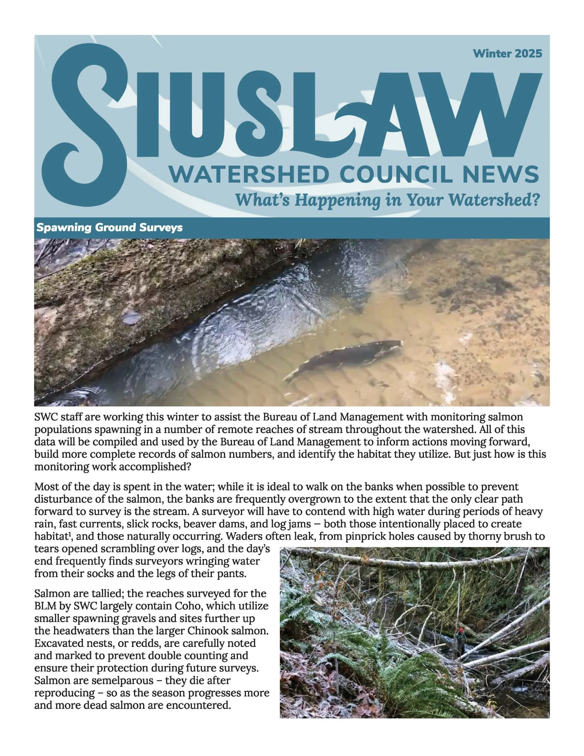 The Siuslaw Watershed Council supports sound economic, social and environmental uses of natural and human resources in the Siuslaw River Basin.