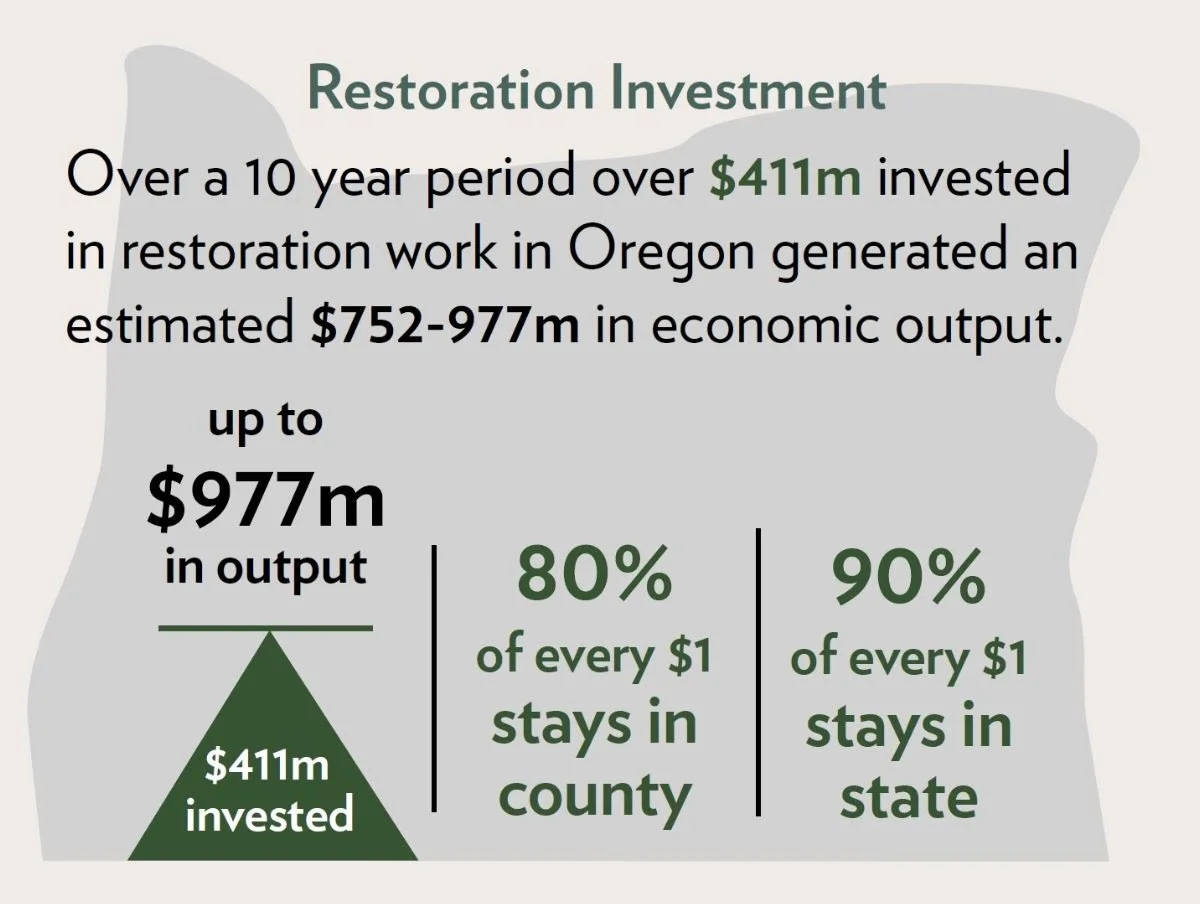 Ecotrust found that between 2001 and 2010, the total investments in 6,740 restoration projects completed in Oregon supported between 4,628 and 6,483 jobs. Of those jobs created throughout the state, approximately 355 jobs were created/supported in Lane County and 426 in Douglas County. Investments in restoration are investments in local jobs, and our local economy. Bob has partnered with the Siuslaw Watershed Council on important restoration projects on Fish Creek, Esmond Creek, and the North Fork of the Siuslaw River. The mechanical work he does for placement of large woody debris in these projects increases habitat complexity, restores floodplain connectivity, reinstates natural stream meanders, forms pools, adds spawning gravels, and creates side channels for fish and other riparian species.