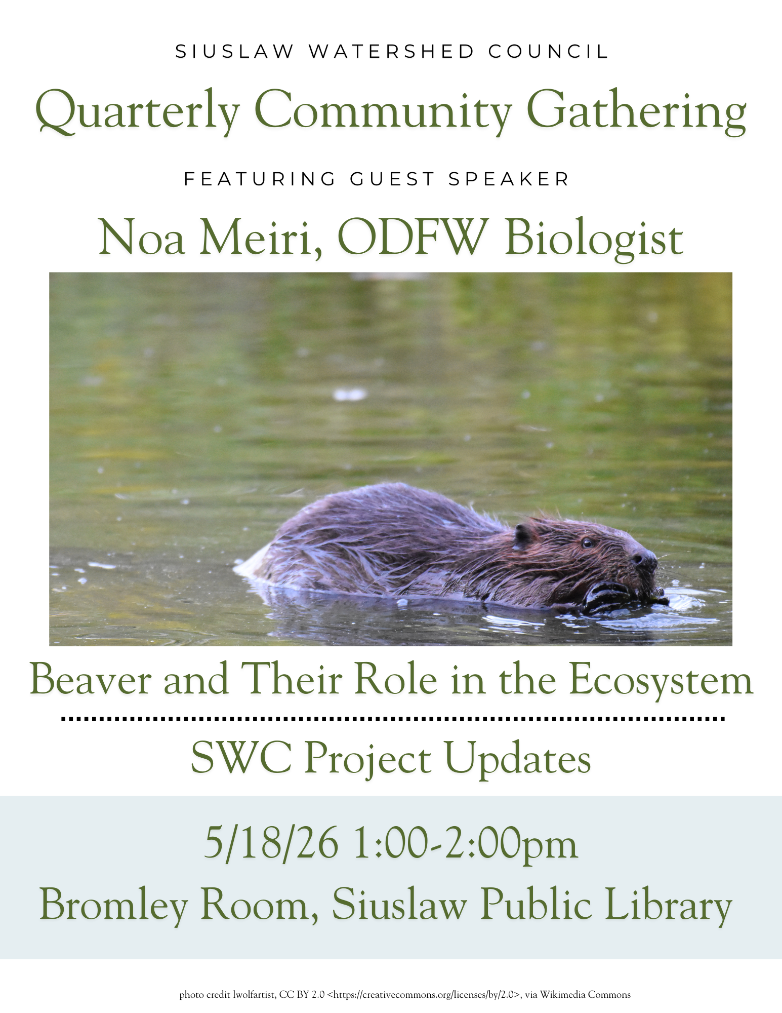 Join the Siuslaw Watershed Council for a community meeting with guest speaker Noa Meiri to learn about beaver in Oregon. Topics covered will include ways to coexist with beaver on your property, benefits that beaver can provide, and ODFW beaver management strategies and initiatives.